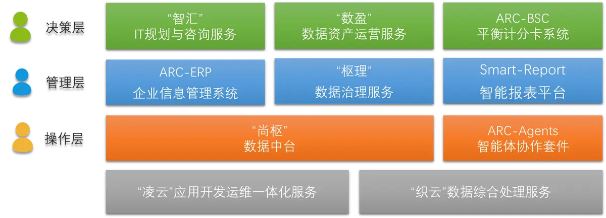 在決策層,“智匯”IT規(guī)劃與咨詢服務(wù),憑借專業(yè)團隊對行業(yè)趨勢和技術(shù)生態(tài)的深度洞察,為企業(yè)量身定制契合發(fā)展戰(zhàn)略的IT架構(gòu)藍圖,明晰數(shù)字化路徑;“數(shù)盈”數(shù)據(jù)資產(chǎn)運營服務(wù),挖掘企業(yè)數(shù)據(jù)價值,將分散數(shù)據(jù)轉(zhuǎn)化為可運營、能創(chuàng)造效益的資產(chǎn),驅(qū)動業(yè)務(wù)創(chuàng)新;ARC - BSC平衡計分卡系統(tǒng),以戰(zhàn)略為導(dǎo)向,從財務(wù)、客戶、內(nèi)部流程、學習與成長等維度,量化指標、監(jiān)控進度,助力科學決策 。
